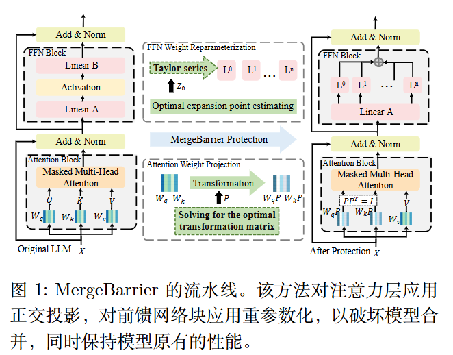 核心思想: MergeBarrier 的基本思路是,成功的模型合并要求各个专家模型位于同一个低损失盆地内,从而形成一条线性路径,其中所有中间点(作为合并后的模型)均处于低损失盆地内并保持高性能。为阻止模型合并,我们对原始模型的权重进行变换,将
