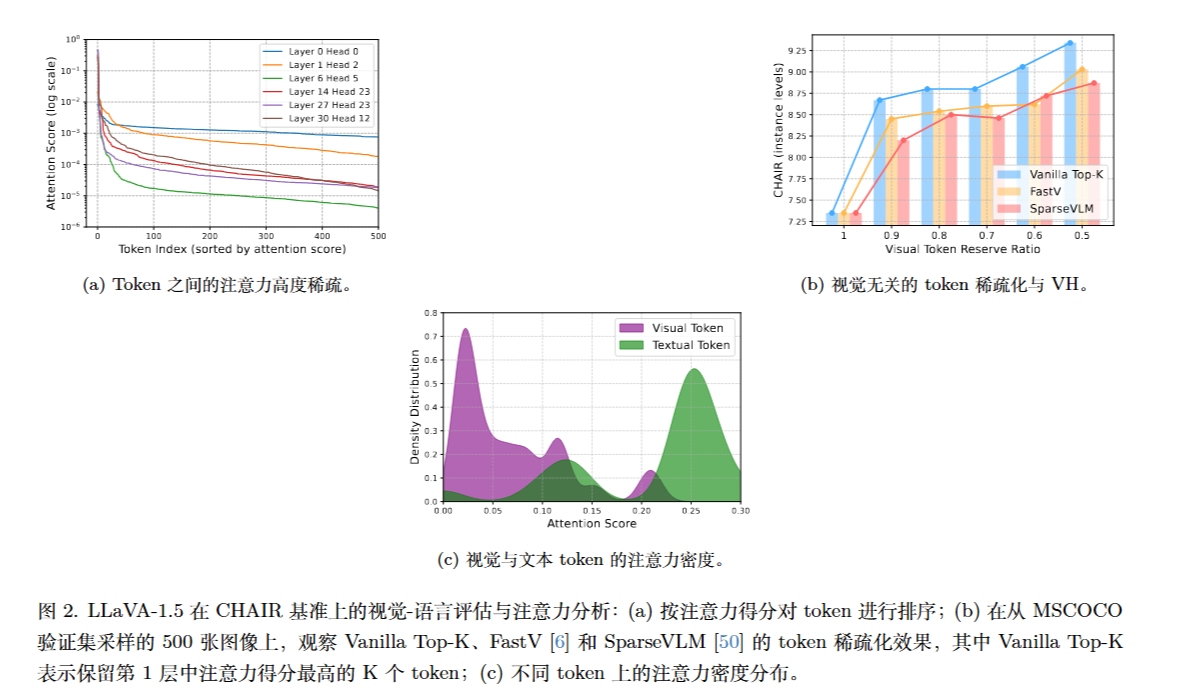如果直接使用传统的 Token 稀疏化方法(如仅基于 Top-K 的剪枝),随着稀疏度增加,模型的幻觉反而会变严重。因为这种方法容易剪掉注意力分数较低但对图像理解至关重要的视觉。