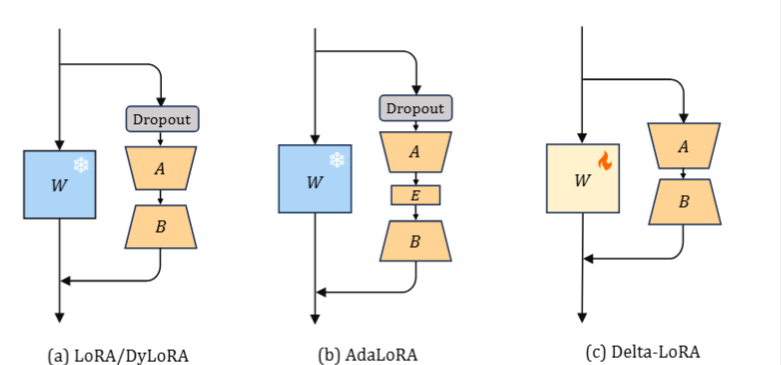 (ii) 原本集成在传统 LoRA 模块中的Dropout层,在 Delta-LoRA 中被省略。这种省略源于认识到其存在违反了所需的假设$\frac{\partial \mathcal{L}}{\partial W}=\frac{\partial \mathcal{L}}{\partial AB}$。