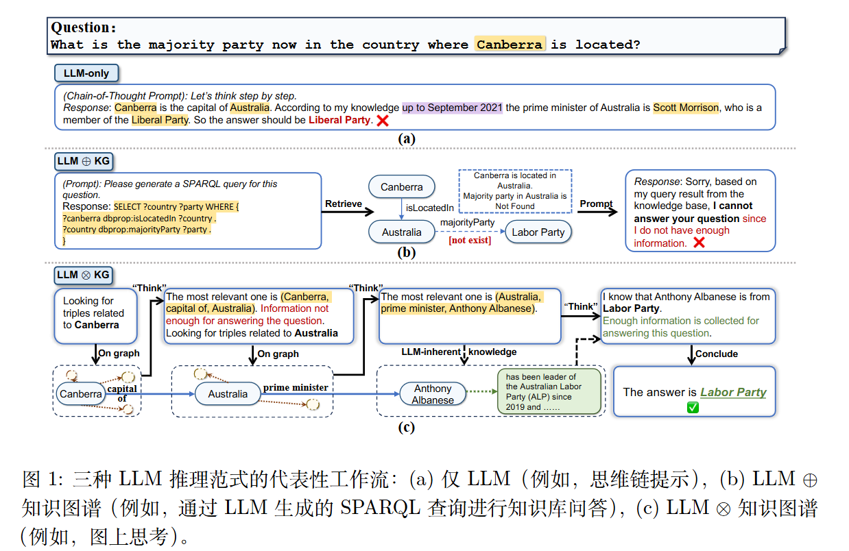 然而目前现有的结合方法通常是 比较简单的模式(作者称为$LLM\oplus KG$,例如用 LLM 生成 SPARQL 查询语句),这种“松耦合”模式中,LLM 仅作为翻译器,不直接参与推理过程。如果生成的查询语句有误或 KG 缺失特定关系,推理就会失败 。