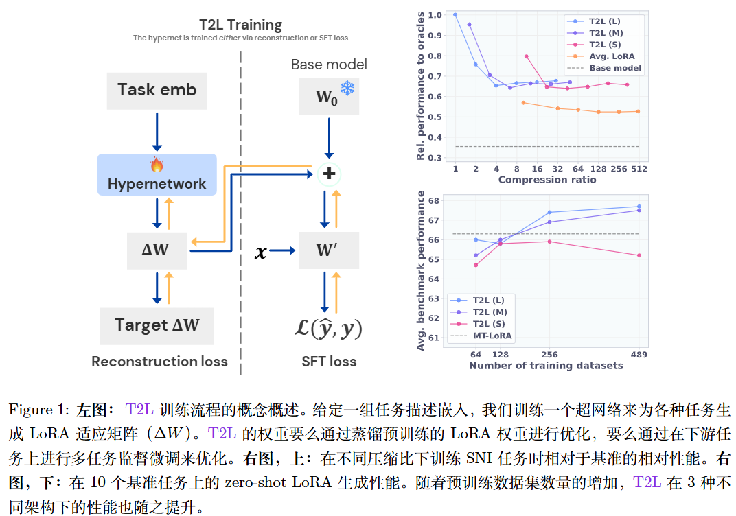 先训练好几百个特定任务的 LoRA(作为 Oracle/老师),然后训练 T2L 去“模仿”这些 LoRA 的参数权重 。