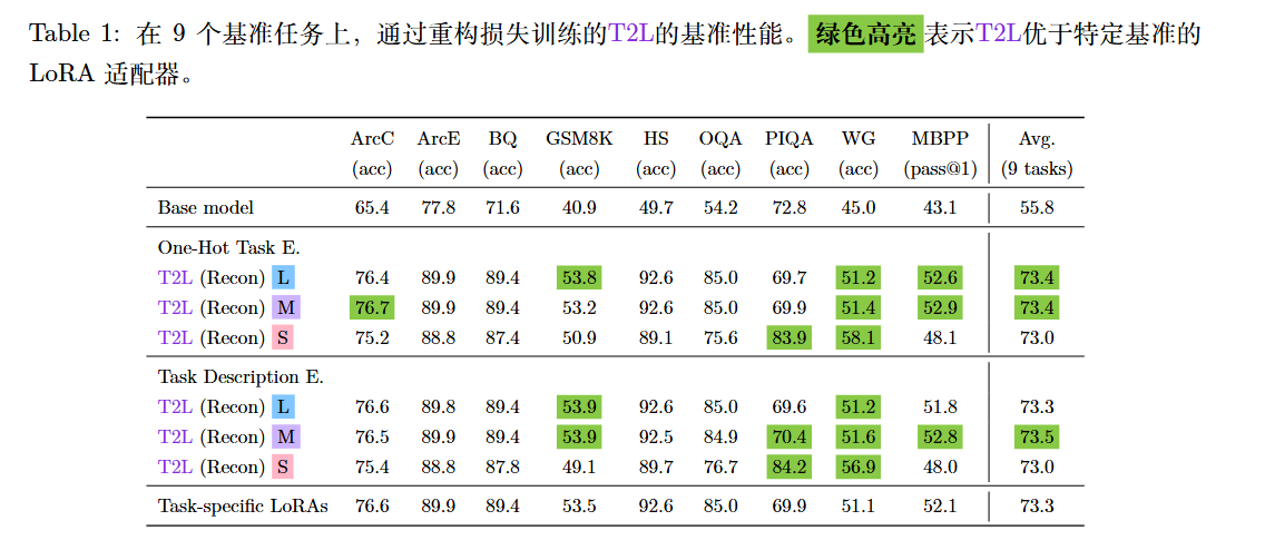T2L 能够学习将“任务描述语义”映射到“有效的 LoRA 参数”。