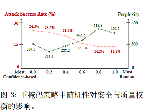 作者尝试采用随机采样来代替贪婪策略,结果如下图所示。这种安全性的提升并非没有代价:随机性的增加也导致生成困惑度上升,从而降低了内容质量。
