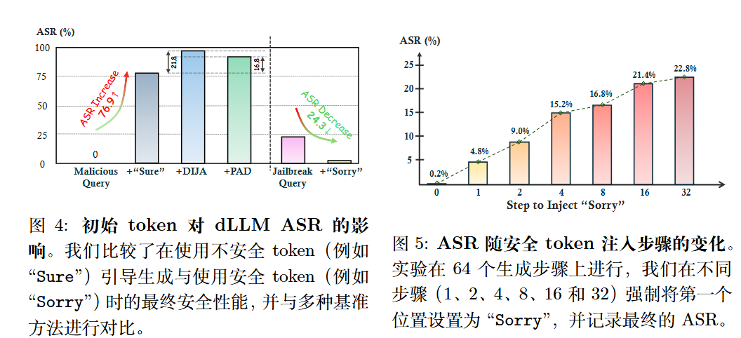 结果如下图:生成轨迹的安全性受到初始 token 性质的强烈引导。即使是一个简单的 “Sure” token,也足以使模型的 ASR 提升 76.9%,而 “Sorry” token则有效将其降低 24.3%。