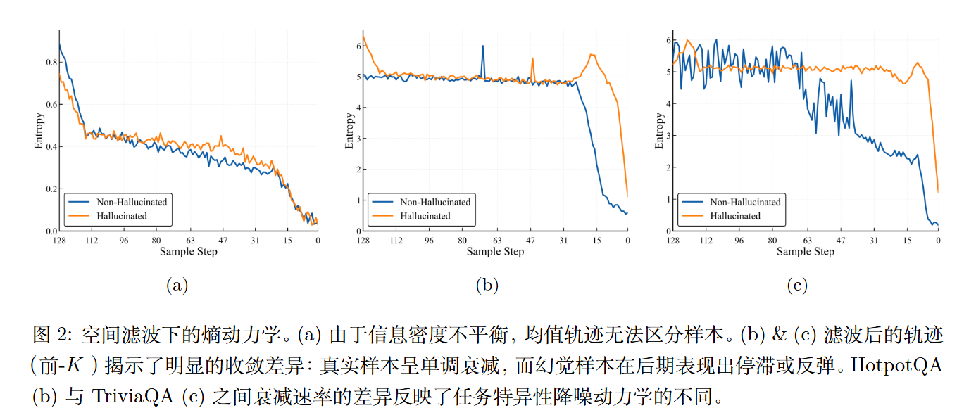 - 空间维度的信息密度不平衡:D-LLMs 会生成固定长度的序列,其中大部分 token 只是为了维持长度而存在的结构性填充或中间猜测,包含极少的幻觉信号 。简单地汇总所有 token 的不确定性,会使真正的幻觉信号被大量无信息的 token 淹没 。