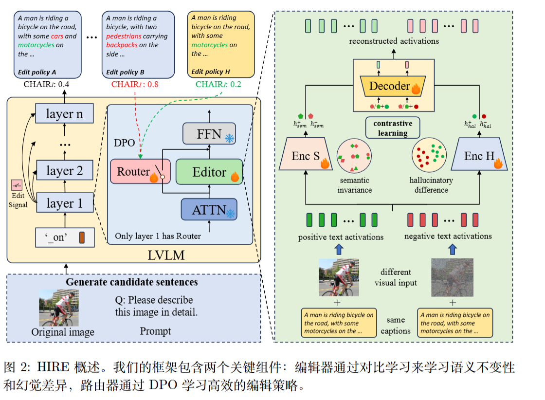 Editor 的训练(对比学习 InfoNCE): 作者用原图生成“正样本”(低幻觉),用加了噪声的模糊图生成“负样本”(高幻觉)。语义编码器的损失函数 $L_{tl,sem}^+$要求正负样本的语义特征保持高度相似(因为句子没变);而幻觉编码器的损失函数 $L_{tl,hal}^+$ 则要求强行拉开正负样本的幻觉特征距离。